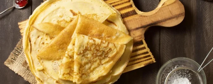 - Verhit een koekenpan goed, giet het pannenkoekenbeslag erin (de pan niet oliën), verdeel het over het hele oppervlak en bak het aan beide kanten goudbruin.